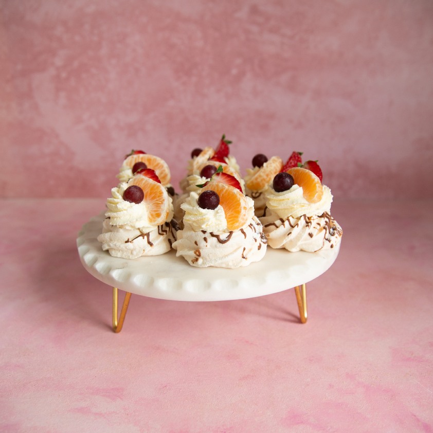 Meringue nests dipped in milk chocolate filled with fresh cream & fresh fruits