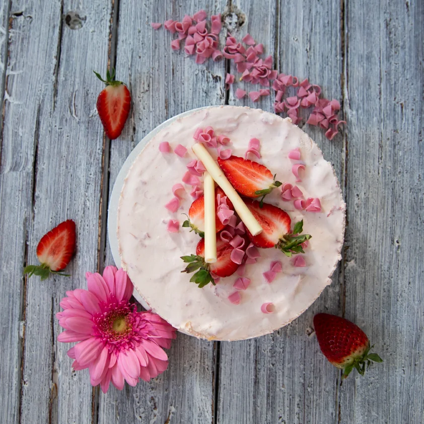 Strawberry Cheesecake made with philadelphia cream cheese. Topped onto a digestive biscuit crumb base