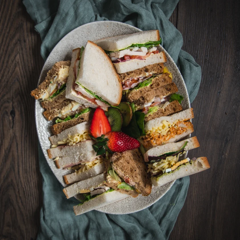 White & brown bread sandwiches with an assortment of fillings, quartered in a kraft