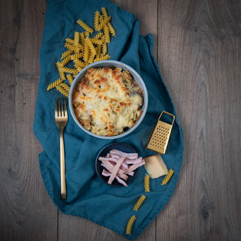Chicken breast, bacon, sauteed mushrooms & fusilli pasta. Topped with white wine sauce, spring onions & cheddar cheese