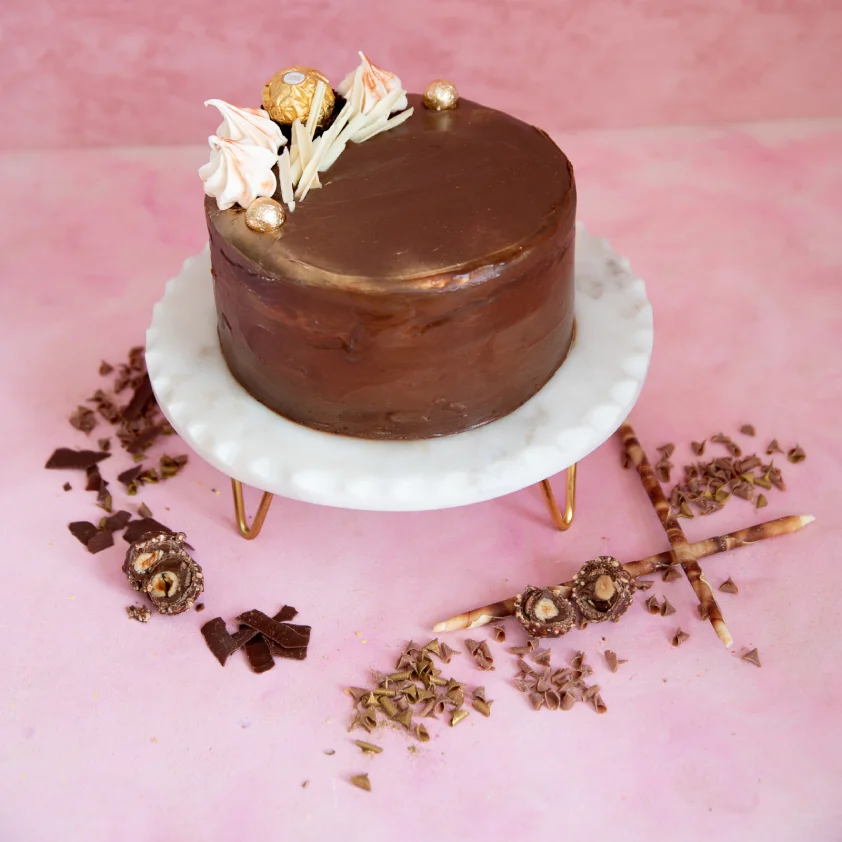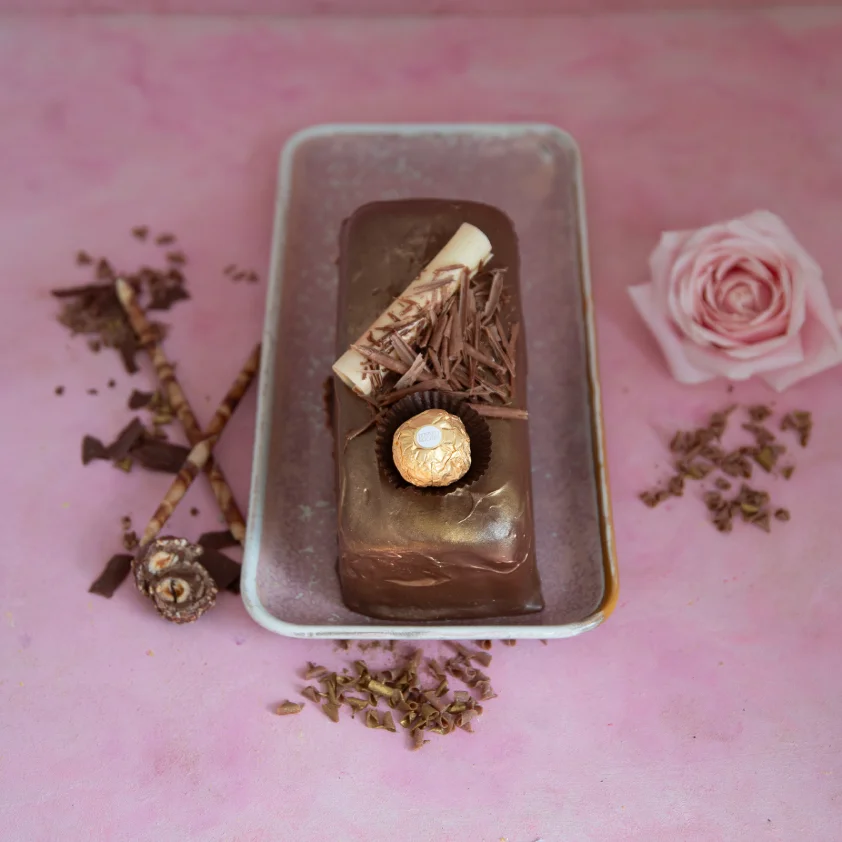 Moist chocolate sponge with a secret ingredients. Filled with layers of belgian chocolate ganache and finished with this beautiful glossy chocolate finish